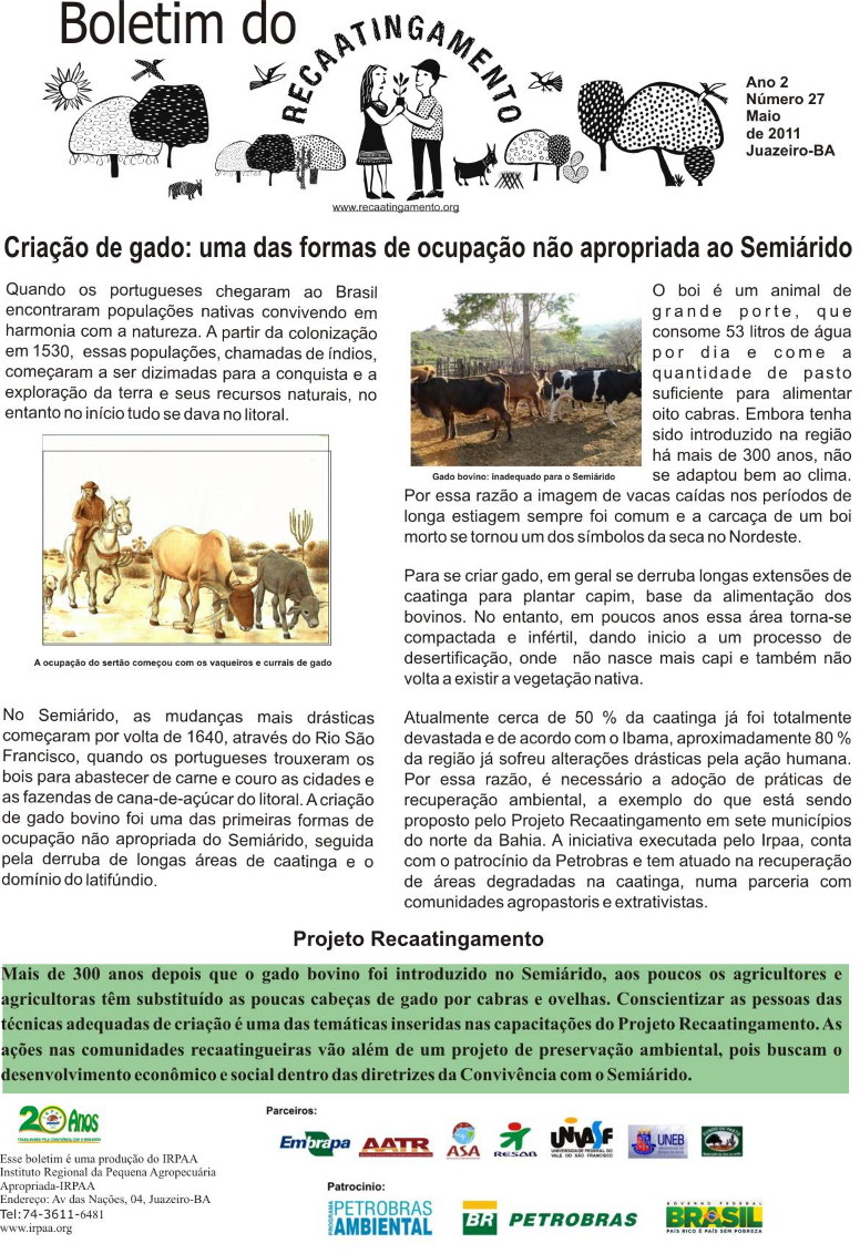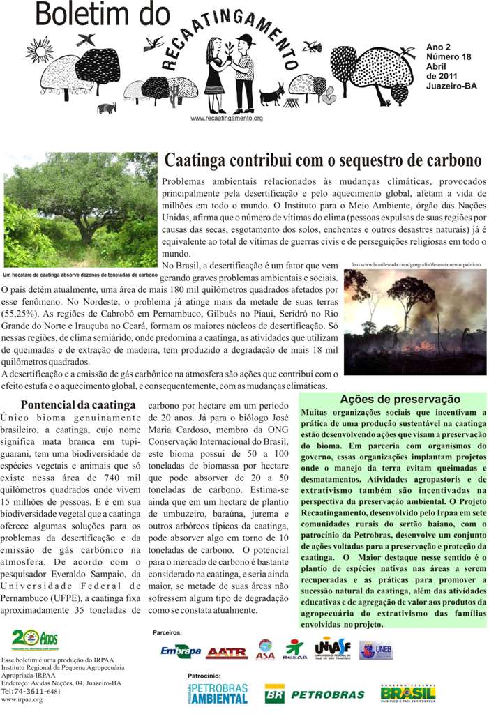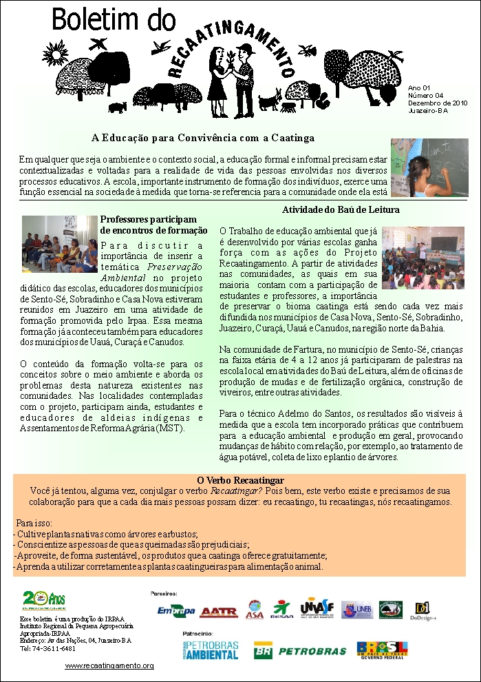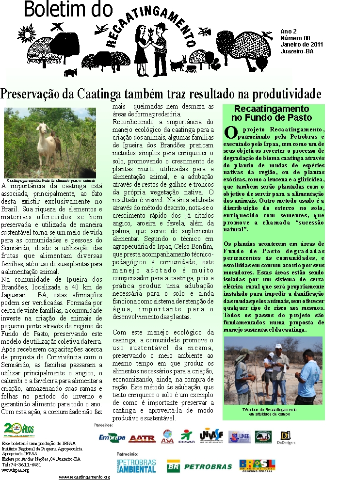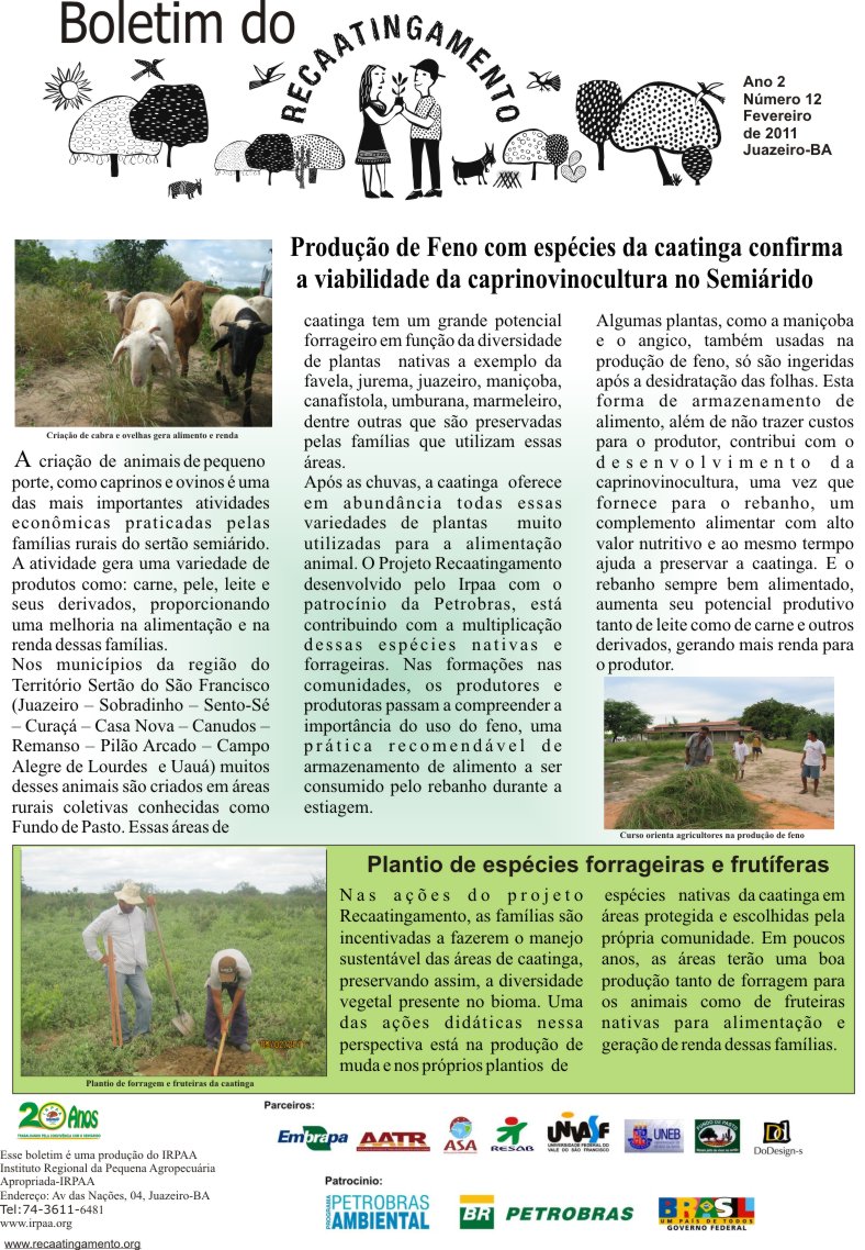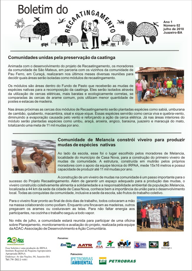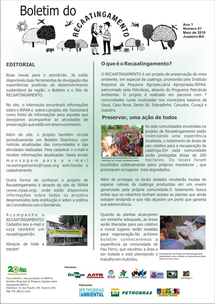 Os boletins informativos do Recaatingamento reúnem 30 edições produzidas entre os anos de 2010 e 2011, formando um valioso acervo documental sobre a trajetória inicial do projeto. As edições trazem registros de campo, entrevistas com agricultores e agricultoras, relatos de experiências, resultados das ações desenvolvidas e reflexões coletivas sobre os desafios e aprendizados no processo de regeneração da Caatinga. Os conteúdos abordam temas como agroecologia, manejo sustentável dos recursos naturais, recuperação de áreas degradadas, proteção da biodiversidade, organização comunitária e fortalecimento das práticas tradicionais. Além de informar, os boletins cumprem um papel formativo e político, servindo como instrumento de mobilização e troca de saberes entre as comunidades envolvidas e demais interessados na convivência com o Semiárido.