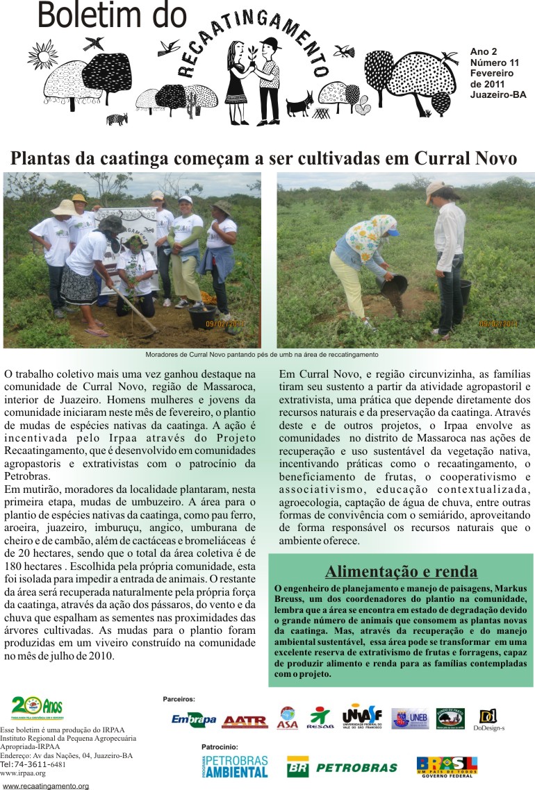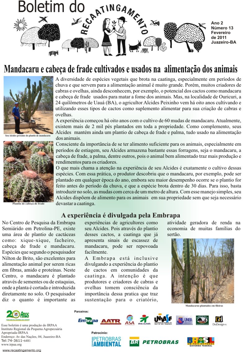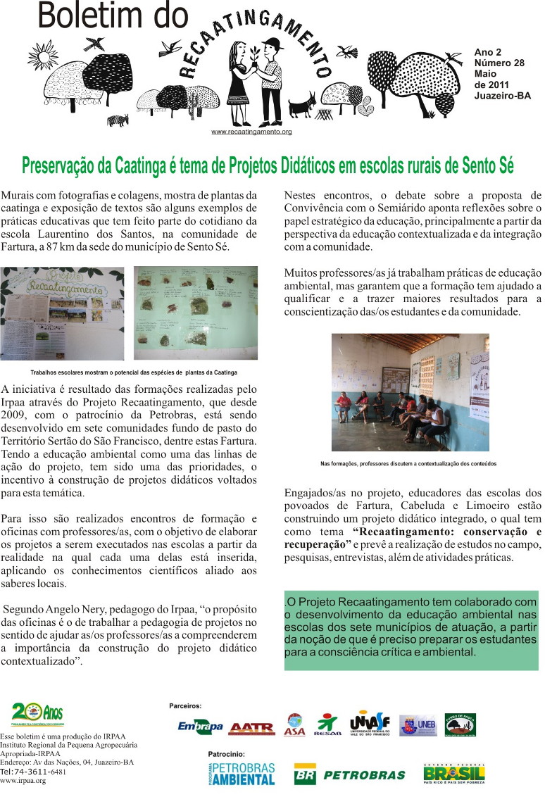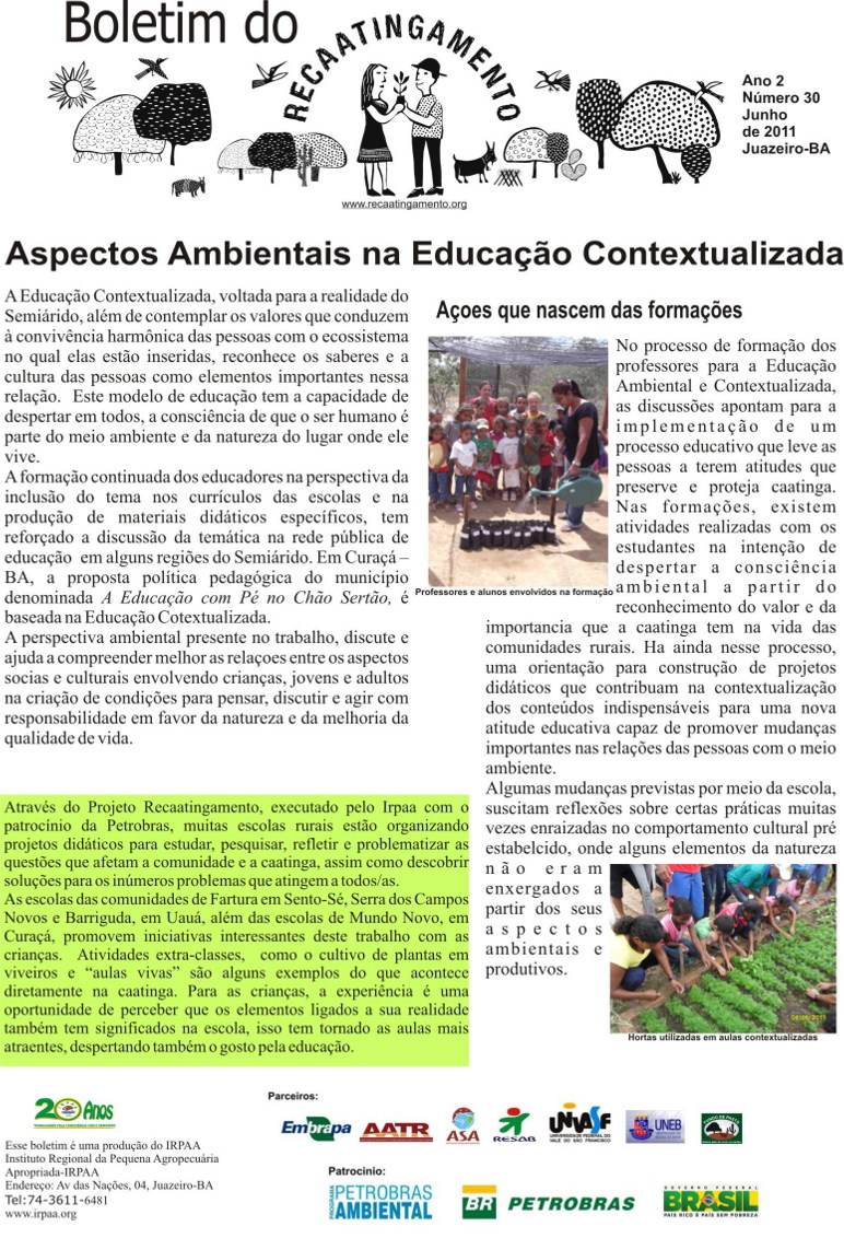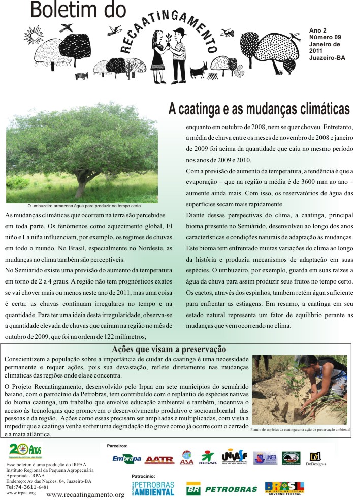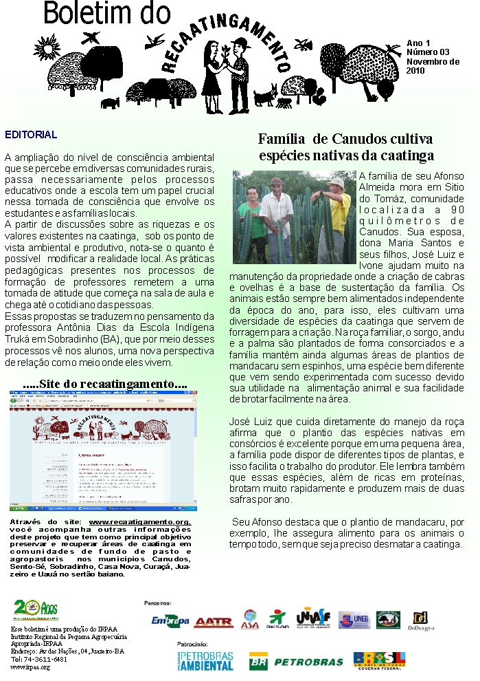 Os boletins informativos do Recaatingamento reúnem 30 edições produzidas entre os anos de 2010 e 2011, formando um valioso acervo documental sobre a trajetória inicial do projeto. As edições trazem registros de campo, entrevistas com agricultores e agricultoras, relatos de experiências, resultados das ações desenvolvidas e reflexões coletivas sobre os desafios e aprendizados no processo de regeneração da Caatinga. Os conteúdos abordam temas como agroecologia, manejo sustentável dos recursos naturais, recuperação de áreas degradadas, proteção da biodiversidade, organização comunitária e fortalecimento das práticas tradicionais. Além de informar, os boletins cumprem um papel formativo e político, servindo como instrumento de mobilização e troca de saberes entre as comunidades envolvidas e demais interessados na convivência com o Semiárido.