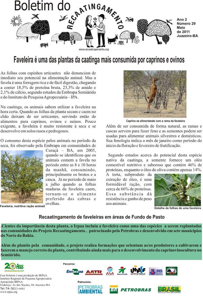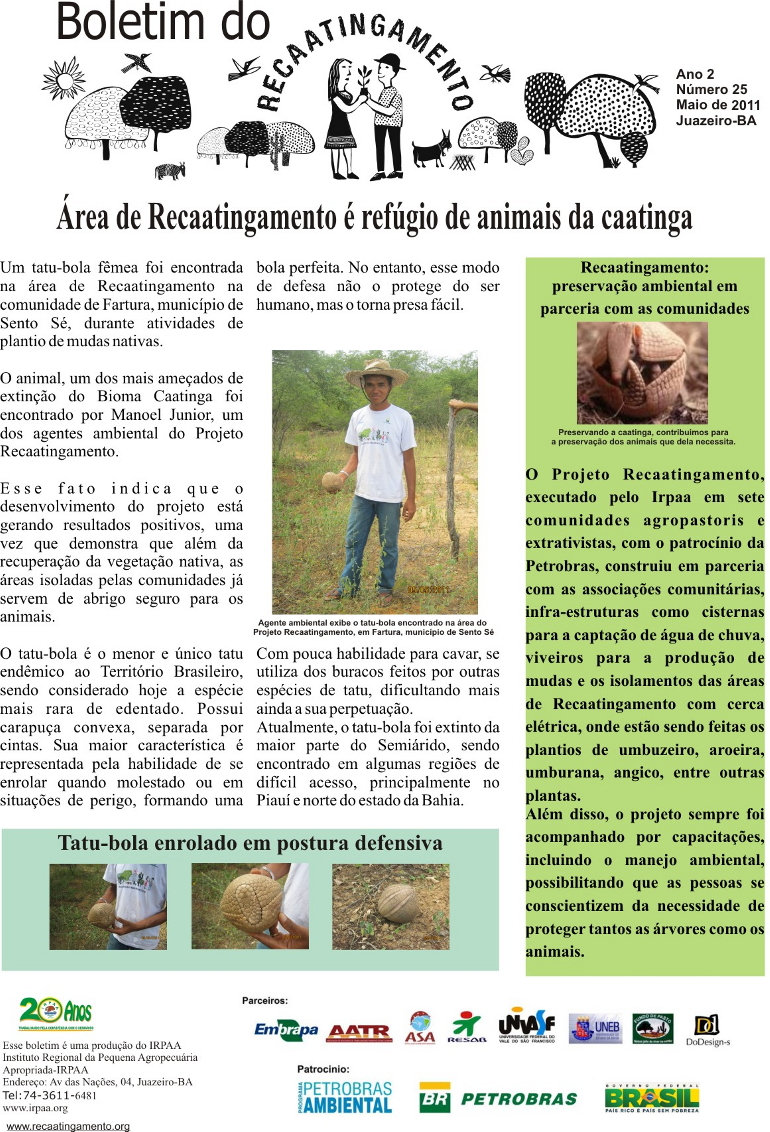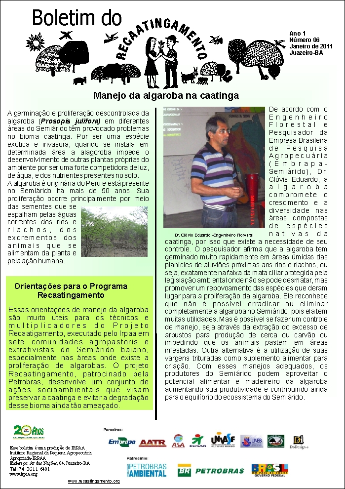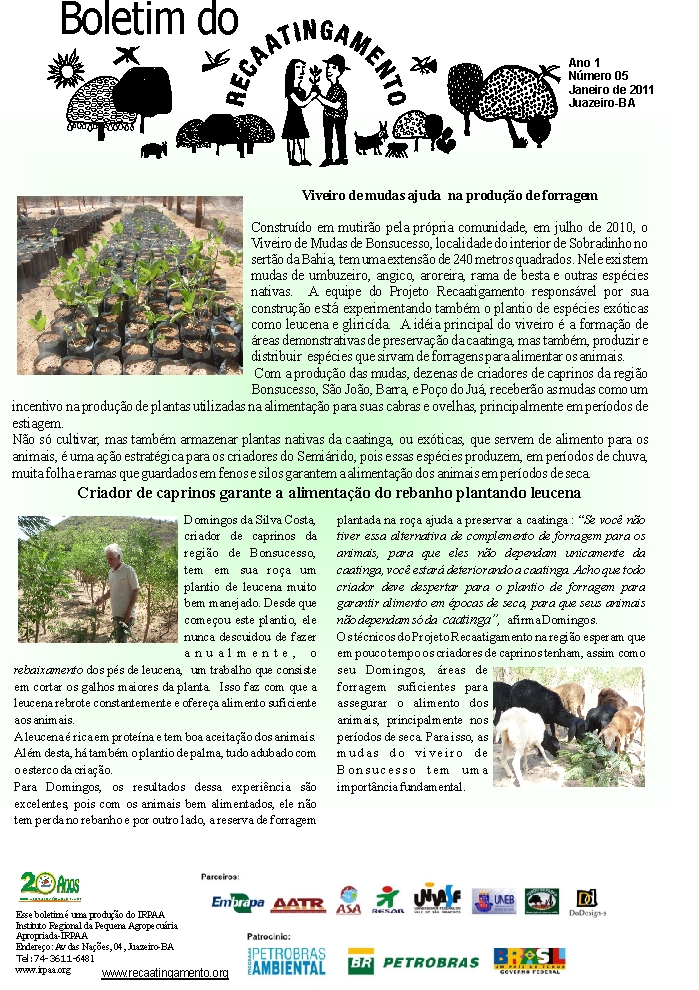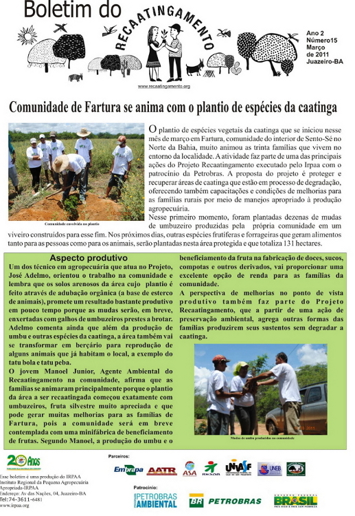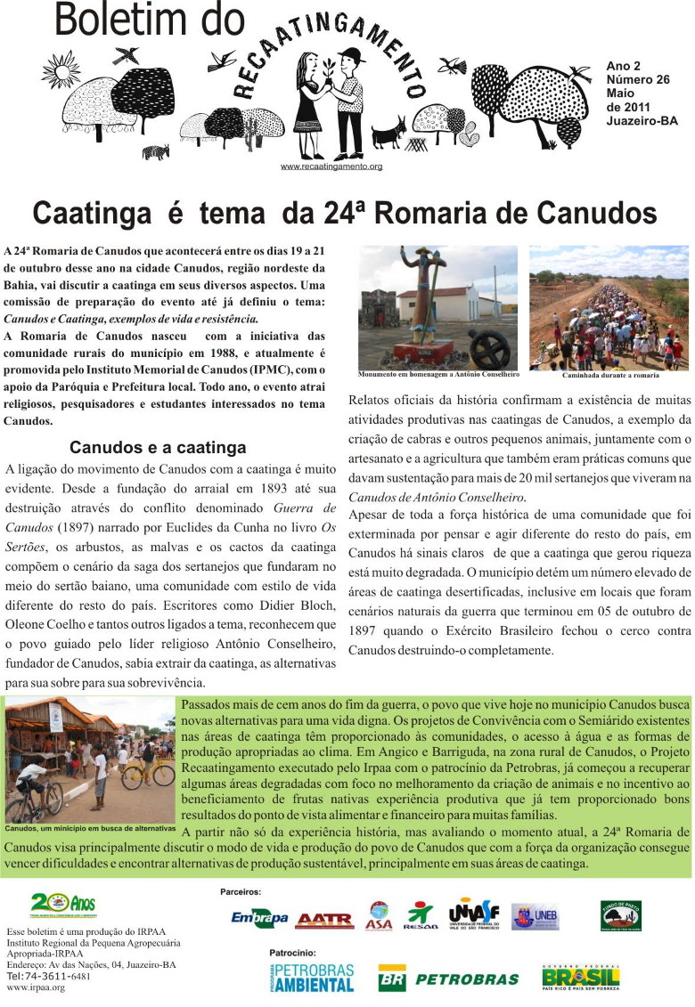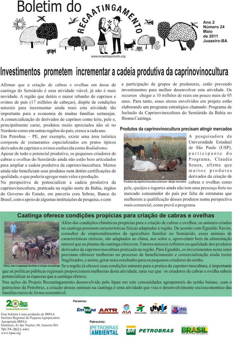 Os boletins informativos do Recaatingamento reúnem 30 edições produzidas entre os anos de 2010 e 2011, formando um valioso acervo documental sobre a trajetória inicial do projeto. As edições trazem registros de campo, entrevistas com agricultores e agricultoras, relatos de experiências, resultados das ações desenvolvidas e reflexões coletivas sobre os desafios e aprendizados no processo de regeneração da Caatinga. Os conteúdos abordam temas como agroecologia, manejo sustentável dos recursos naturais, recuperação de áreas degradadas, proteção da biodiversidade, organização comunitária e fortalecimento das práticas tradicionais. Além de informar, os boletins cumprem um papel formativo e político, servindo como instrumento de mobilização e troca de saberes entre as comunidades envolvidas e demais interessados na convivência com o Semiárido.